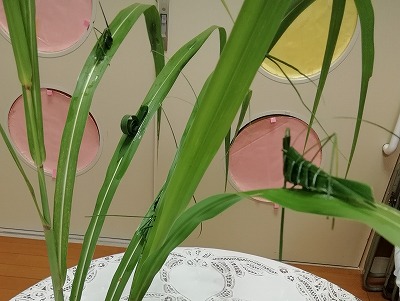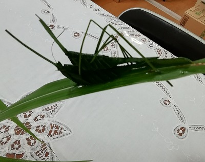 「子ども達に見てもらえると、嬉しいな」と、時間外職員(谷津ミュージアムで自然観察員として活動しています)が、ガマ(姫蒲)の葉で作った草バッタ、草カタツムリを持ってきてくれました。