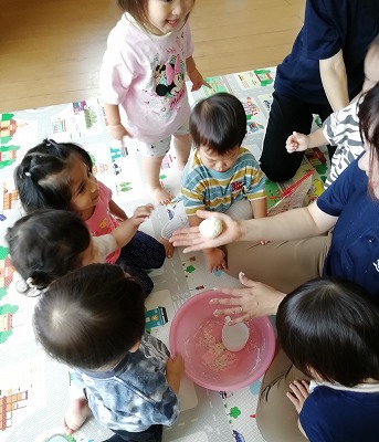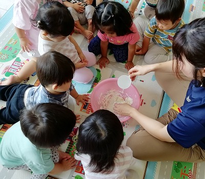 小麦粉を容器に入れます。「なんだろう?」と、少し離れて保育者の様子を見ている子ども達でしたが、水を入れるとだんだん近づいてきて、小麦粉がまとまる様子をじっと見ています。
