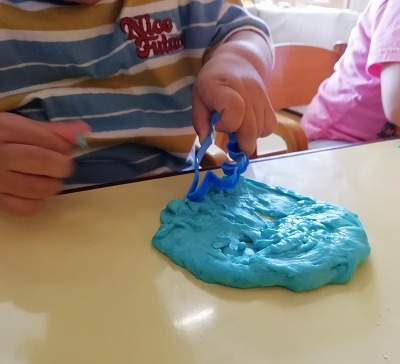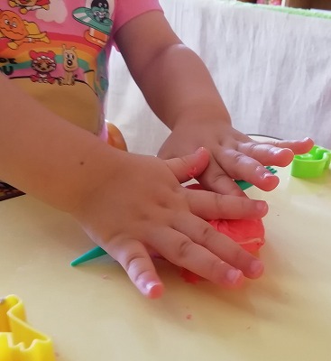 色の小麦粉粘土を手の平全体を使って混ぜ、色の変化を楽しんでいます。