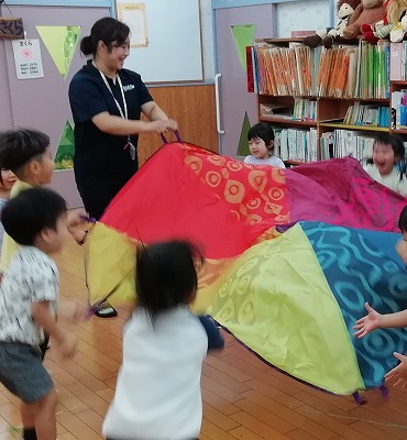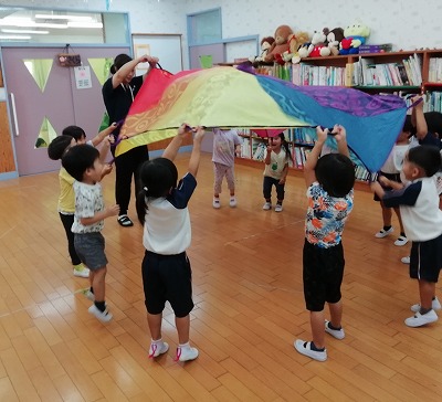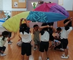 先日、3歳児のクラスでバルーン遊びをしました。お兄さん、お姉さんがやっているのを見ていて、やりたい気持ちがいっぱ~い!! 普段からリトミックのシフォン・スカーフなど布を使った体操が大好きなので、大きな布に大喜び。
