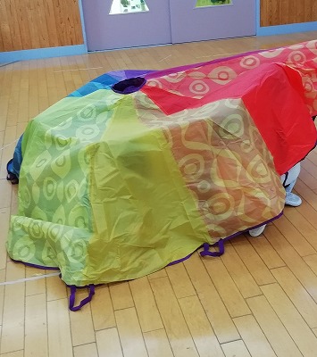 誰もいなくなっちゃった…。 バルーンの中から「ウフフッ」「エヘヘ…」「シー。見つかっちゃうよ」と小声で話す声が聞こえてきました。保育者は「あれ? どこへ行っちゃったの?」「みんな、どこかな?」と探しました! 大技、大成功です。