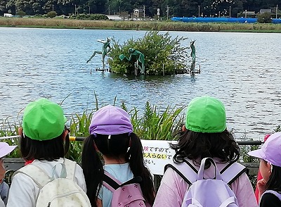 自然観察が目的でしたが、「歯だ~」「カッパ~! カッパが3人いるよ~」と、あちこちにあるモニュメントや彫像にも興味を持って話をしていました。