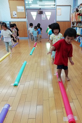 プールで使う円柱のスティックを縦半分に切ったものを並べ、その上を裸足で歩きます。しっかり足でスティックをつかんで、1歩ずつバランスをとりながら進みました。