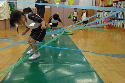 次に待っているのは、クモの巣くぐり(クモの巣はスズランテープでつくりました)。「どうやって進もうかな?」と慎重に考えてからスタート。 クモの巣にあたらないように姿勢を低くして、