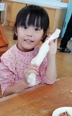 ロールサンド作りでは、イチゴ、 マーマレード、ブルーベリーをパンの上にのせて、 くるくると丸めました。 「みてみて~! できたよ!」、キャンディ型のロールサンドがたくさんできました。