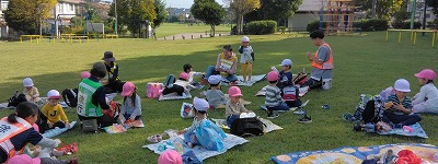 柏鳳保育園から徒歩2分の所にある中峠台鹿島前公園へ、秋の自然を見つけに出かけました。4歳児クラスのお兄さん、お姉さんと一緒です。