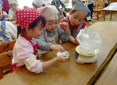 材料の計量からスタート! 「あと、少し入れよう! あっ〜、ピッタリ!」と計量器から目が離せません。そして、 材料をよ〜くもみもみ!コネコネ!します。