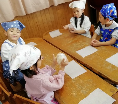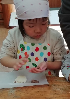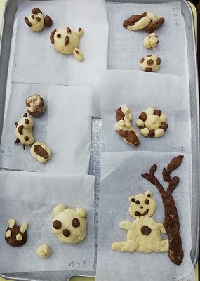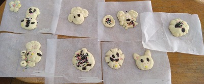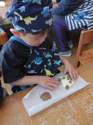 3歳児の子ども達はパン生地を丸め、耳をつけて動物の形にし、干しブドウで目をつけていました。雪だるまやベイマックスを作った子もいます。