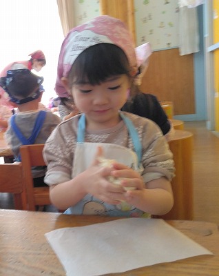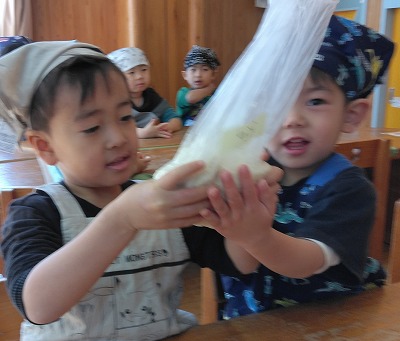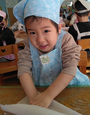 まず、3歳児クラスが生地作りをしている様子です。「もみもみ!」「だんだん固まってきたよ!」