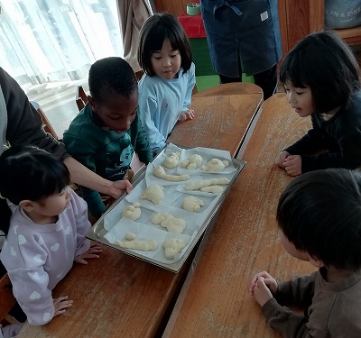 5歳児クラスのパン作りを聞いて、3歳、4歳児クラスの子ども達もパン作りに取り組みました。 前日に生地を作り、翌日に形を作り、トッピングをしました。