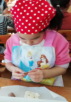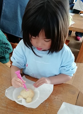 4歳児の子ども達は、形にしたパンが発酵して、大きくなったことに驚いていました。 焼き上がったパンにチョコペンでトッピングしました。目や口を描いたり、模様を描いたり、真剣です。