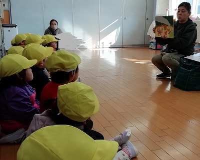 まず、火事の様子を描いた紙芝居を見ました。話の中に出てきた「おかしも」は、避難する時の合言葉です。