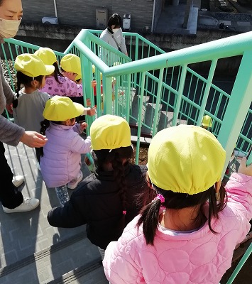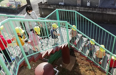 実際に降りてみると、いつも使っている階段と違うせいか、「怖かった」と言う子もいましたが、みんな、静かにじょうずに避難できました。 災害はいつ起こるかわかりません。生活の中に、役立つ体験を取り入れていきます。