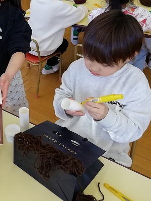 保育園最後の節分集会! まず、鬼のお面作りから始めました。「角は、黄色と黒のシマシマにして」「髪の毛は、クルクル丸めて」と、紙袋やスチール皿、トイレットペーパーなど、廃材を使って鬼のお面を作りました。自分の中の鬼を追い出すぞ!と皆、張り切って作っていました。