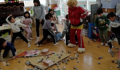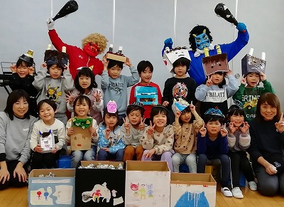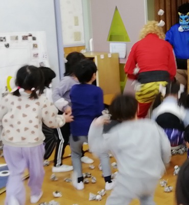「鬼は外〜! 鬼は外~!」、みんなで作った新聞豆を投げると、鬼は背を向けて逃げていきます