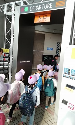 入口は、搭乗ゲートのようです。「なんか、ドキドキするね」と話しています。