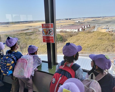 展望台の窓からは、飛行機が飛び立つところも見ました。「飛んだ~、すごい!」と大歓声です。