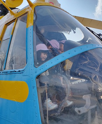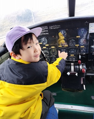 外の芝生広場には大型模型の展示スペースがあり、飛行機やヘリコプターの運転席に座ることもできました。