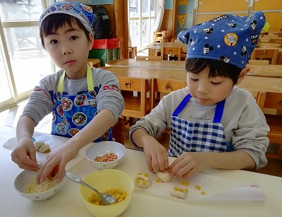 5歳児クラスの子ども達は、コーンやハムを生地の上にのせたり、ウインナーを巻いたりして形を作り、ケチャップやマヨネーズをかけて焼きました。