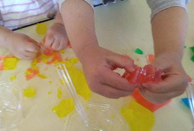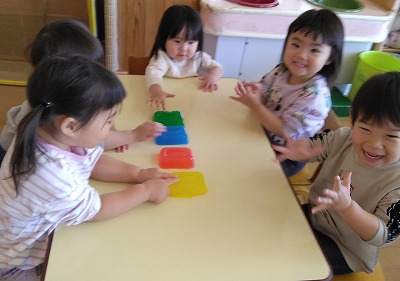 この日、1歳児クラスの子ども達は、園庭で遊ぶグループと、室内で感触遊びを行うグループに分かれて過ごしていました。