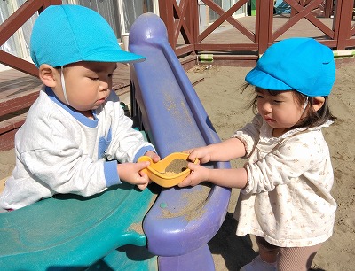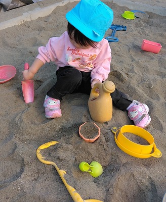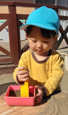 砂場では、シャベルで砂をすくい、小さなカップに入れています。すくう、入れる動作もじょうずになり、何個も同じものを作っています。