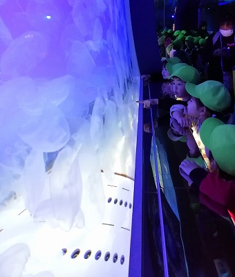 まず、くらげゾーンでゆらゆら揺れるくらげを見て、「スイミーのくらげと一緒!」「こっちのくらげは、まん丸だよ」と種類の違いを発見しました。