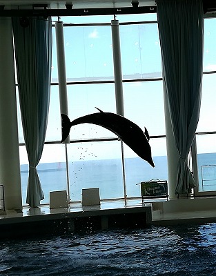 イルカショーは、アシカの演技から始まりました。アシカが手を振ったり、ポーズを決めたりするたびに「すごい!」と、拍手が沸きあがり、イルカが水中からジャンプで登場すると、その高さや水しぶきに歓声が上がっていました。