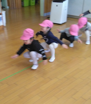 さらに、アヒル歩き。しゃがんで前に進みます。足首をやわらかく交互に出して進みます。足のおくりも上手になりました。