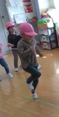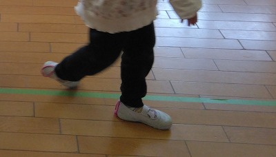 この日、3歳児クラスの子ども達は、床の上に貼った直線を使って、歩く、走る、またぐ、跳ぶなど、体幹を鍛える運動遊びを行いました。(動いている時の写真なので、ぼやけているものがあります)。