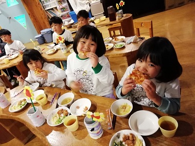 卒園が近づくにつれ、年長児クラスの子ども達から「今日が〇〇の最後…」という言葉を聞こえるようになりました。そんな中、4歳児クラスの子ども達が、「ひまわりさんに、ピザを作ってパーティをしよう」と計画しました。
