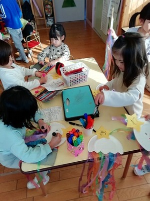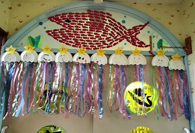 年中児クラスの子ども達は、パーティ会場を「スイミーのレストランにしよう!」と、飾り作りもしました。『スイミー』は、年長児クラスが発表会で行った表現遊びです。