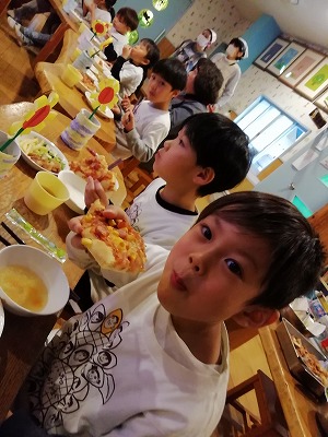 ピザを食べ始めると、この笑顔です。 「ピザ、おいしい!」「 おかわりある?」と、話も食も進みます。