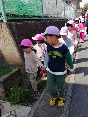 公園までの短い道のりの間でも、5歳児クラスの子ども達が手をつないだ4歳児クラスの子に、前の人との間隔をあけすぎないこと、人の家に入らないこと、止まる所などを上手に伝えていました。卒園したお兄さん、お姉さん達から教わってきたことを、今度は自分たちが教えていくんだと思ったのでしょう。関わりの中で学びがつながっていく場面でした。