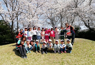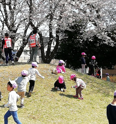 公園に着くと満開の桜が皆を迎えてくれました。 芝山で、鬼ごっこをしたり、花びらを集めたり、芝の上を転がったりして遊びました。