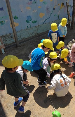 この日、最初に虫を見つけた子どものところに集まってきました。 「どこにいるの?」「 大きいの、いた?」と、のぞき込んで見ています。
