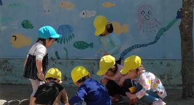 園庭に出ると、すぐに虫探しが始まります。「アリさんがいるー」「見つけた!!」「つかまえてみるね」と、アリを追いかけています。
