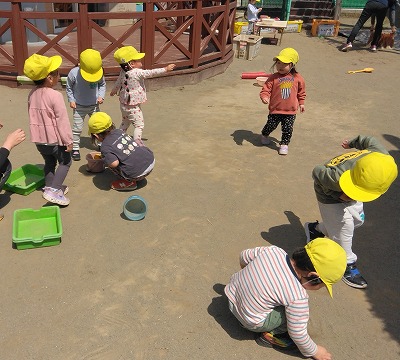 こちらでは、「手でつかまえる?」「 シャベルでつかまえる? 」「バケツでかぶせてみる?」と、子ども達でいろいろ考え始めました。