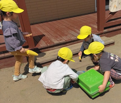 バケツに土や枯れ葉、たんぽぽを入れている子どもがいたので、「何をしているの?」と聞いてみると、「アリさんのおうち、つくってるの」と教えてくれました。完成すると、その中にアリを入れ、様子を観察していました。