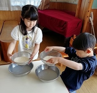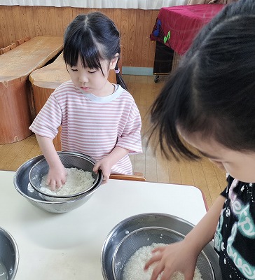 5歳児クラスの子ども達が、「自分達で、ごはん(お米)を炊いて食べる!」を計画し、お昼の献立がご飯の日に合わせて交代で米をとぎ、炊飯器で炊いて食べています。