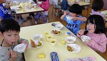 「わぁ~、ほんとに大きい焼きそばだね」と、ワイワイ言いながらできあがった焼きそばを食べようとした時、「スプーンしかないよー」と言う子ども達。内心、「しまった!」と思いながらも園長が「そうだね、どうする?」と聞くと、Aちゃんが「大丈夫、スプーンでも食べられる」と言いながら工夫して食べ始めました。まわりの子ども達もスプーンに何の違和感もない様子で食べています。「なんとたくましい子ども達よ」と思った職員たちでした。