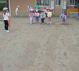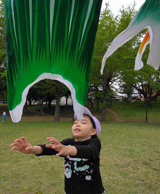 5歳児クラスの子ども達は、「みんなでやろうよ」「きれいだね〜」と話しながら、風がどちらから吹いているのかを確かめ、スカーフをなびかせていました。