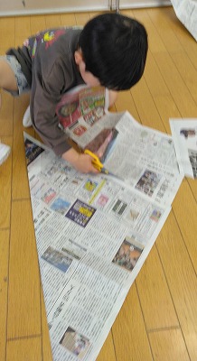 別の日に、こどもの日の由来を聞いた年長児クラスの子ども達は、柏もちやちまきの由来、鯉のぼりを飾る理由などにも興味を持ったようです。 保育者が新聞紙で作ったカブト(兜)をかぶって見せると、「作りたい!」と、カブト作りが始まりました。「ここを折るんだよ」と友だちと教え合いながら作り、「できた!」と大喜びです。