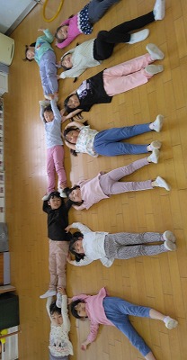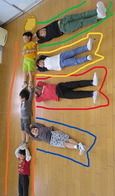 子ども達の「やりたい!」は続き、布で作った鯉のぼりでトンネルくぐりをしたり、「鯉のぼりを体で表現してみよう!」と人間鯉のぼりをしたりしました。 人間鯉のぼりは、「写真をドキュメンテーション(※)に載せて、クイズにして!!」という子ども達からの要望で、ドキュメンテーション載せ、保護者の皆さんにも聞きました。