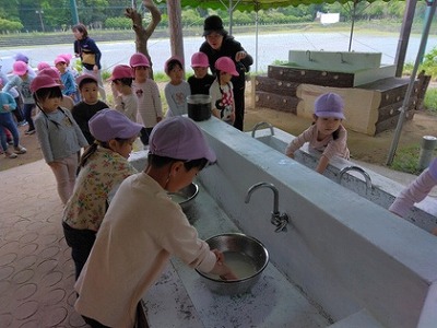 昨年、お兄さん、お姉さんの様子をジーッと見ていた現・5歳児クラスの子ども達は、今回、「自分たちがみんなの分のご飯を作る!」「お米とぎも毎日やっているからできる!」(給食が米飯の日に米とぎをしています)」と、朝からやる気にあふれていました。