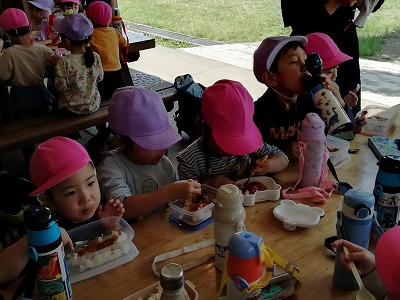 今年度はそのリベンジということもあり、子ども達の好みもしっかり聞き、お湯で温めるカレーを慎重に準備しました。 「カレーライス、おいしいねえ~!!」と、炊飯を初めて経験した4歳児クラスの子ども達が話す横で、昨年の事を覚えていた5歳児クラスの子ども達に「先生、今年はご飯の入ったカレーはないの?」と聞かれ、保育士は大きくうなずき、「ないよ!」と笑顔で答えました。リベンジ大成功です!!