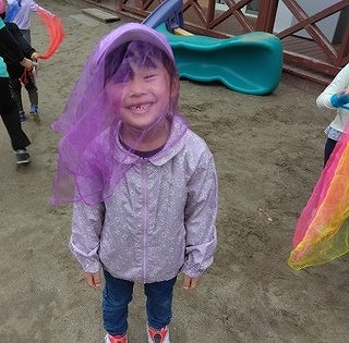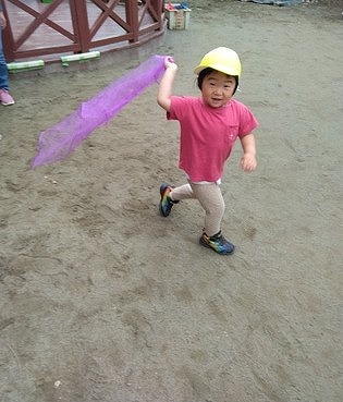 この日から、子ども達は園庭に出るたびに風が吹いているいないにかかわらず、「先生! スカーフ使いたいから出して」と言ってきます。マントのように肩にかけてスーパーマンになって園庭を走ってみたり、お姫様のように首にかけたり頭からかぶったりして遊んでいます。
