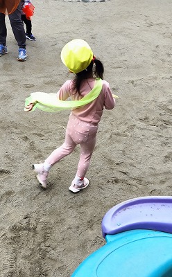 「風でスカーフが顔にくっついたよ~」と気づくと、今度は、「おなかにあてて走ろう!」と言う子どもも。落とさずにどこまで走れるかにも挑戦していました。
