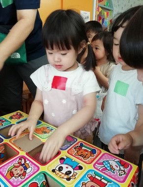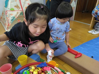 連日の厳しい暑さで戸外遊びはできませんが、子ども達は「かくれんぼしたい〜」「鬼ごっこしたい〜」…。保育者はいろいろ考えて…、人形などを使ったかくれんぼ(宝物探し)をしました。