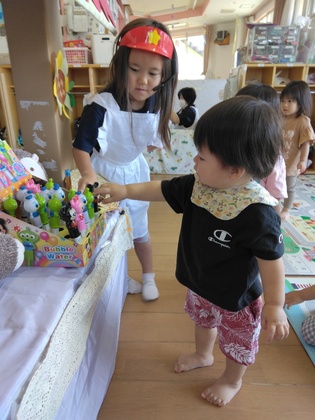 5歳児クラスの子ども達は、「はくほう駄菓子屋さん」になって、0、1歳児クラスの子ども達におみやげを渡します。「令和の駄菓子屋さん!」と称し、インカムをつけた衣装を自分達で考えました。0、1歳児の子ども達も、おみやげを手にして喜んでいました。