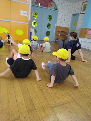 「ダンスタイム~♪」と放送がはいり、大好きな『パイナッポー体操』などをみんなで踊りました。小さいお子さん達も真似て踊っています。